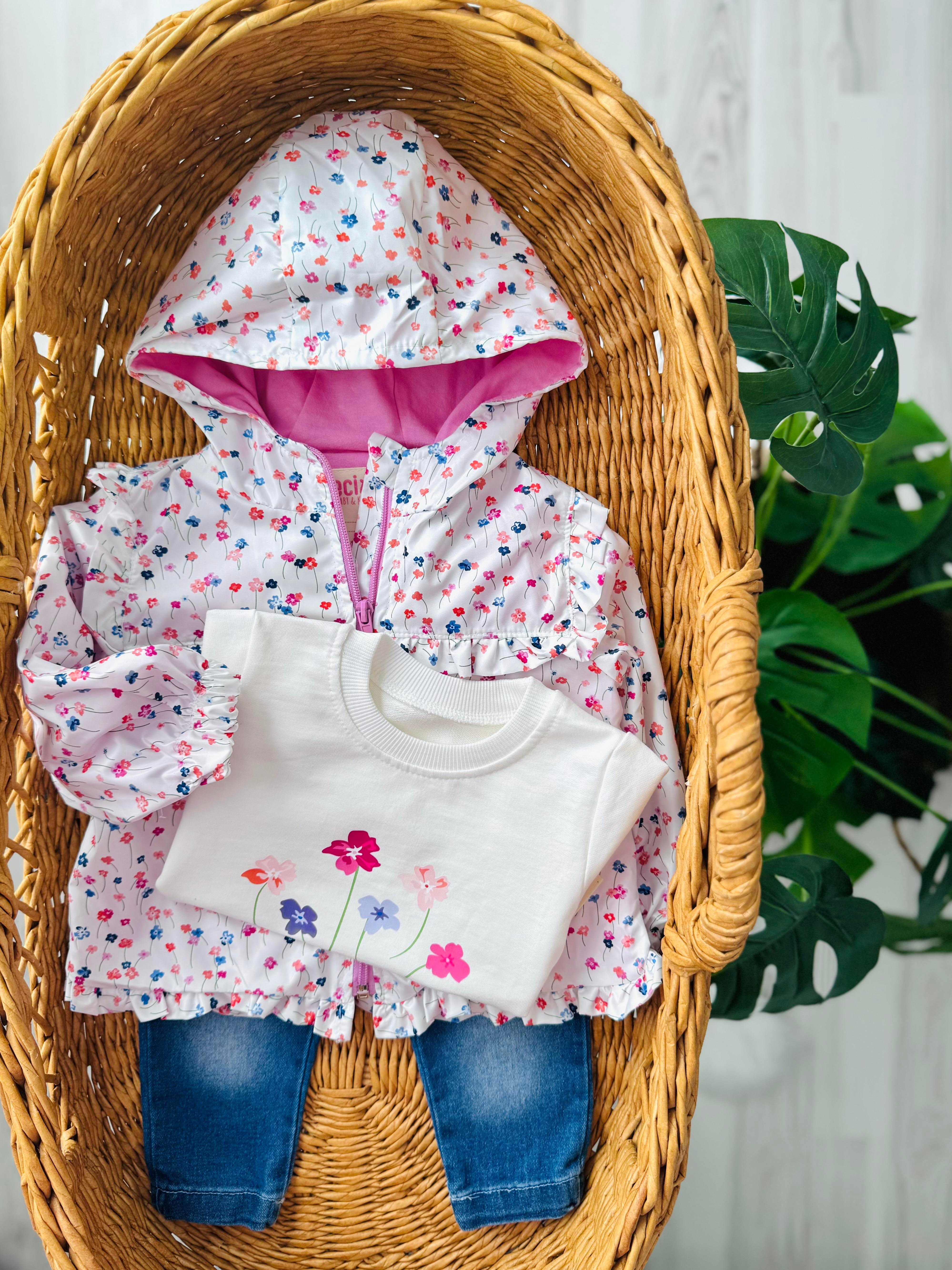 Çiçek Baskılı Yagmurluklu Kot Pantolonlu 3lu Takım