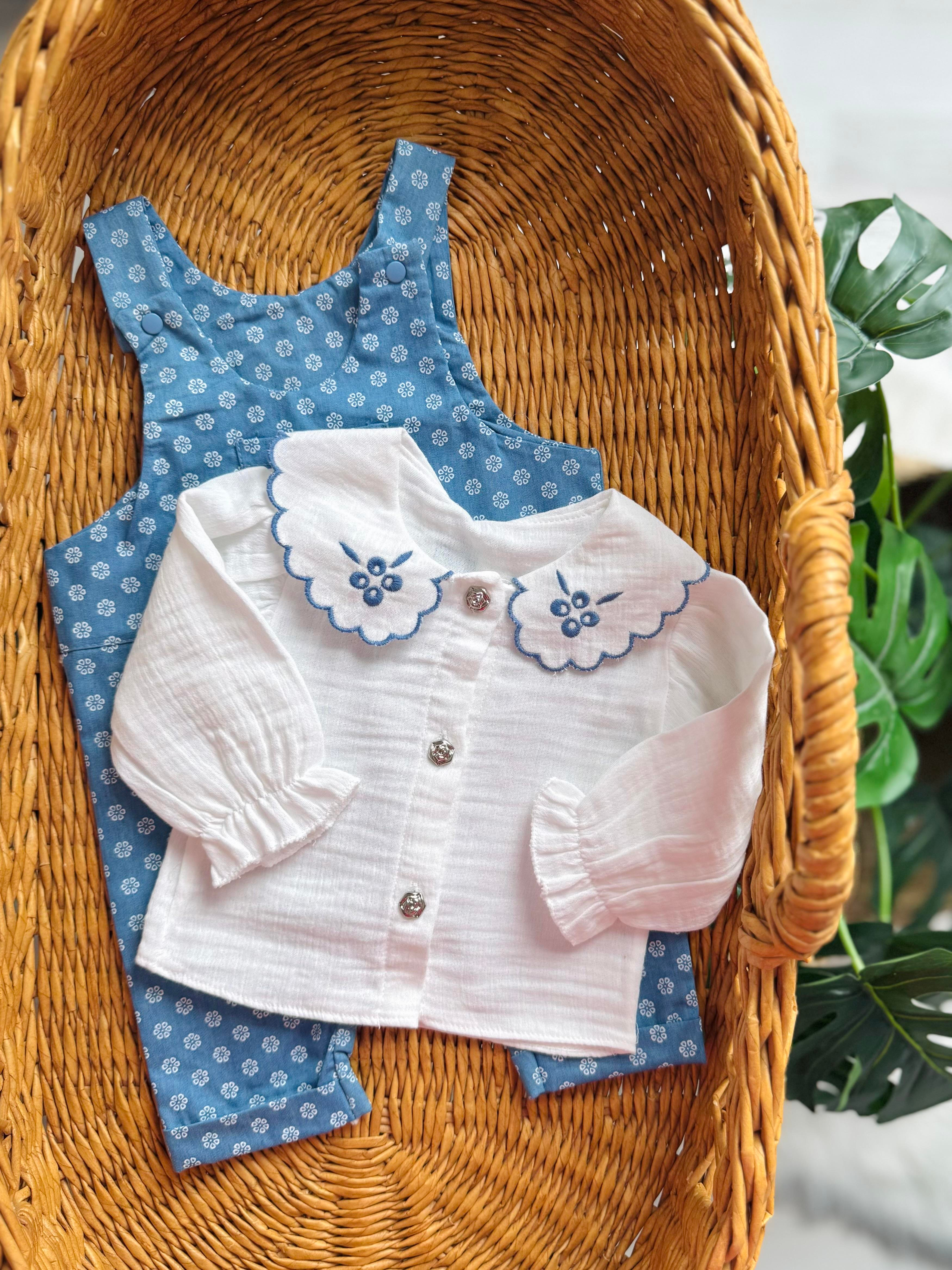Mavi Çiçek İşlemeli Müslin Gömlekli Kot Tulum